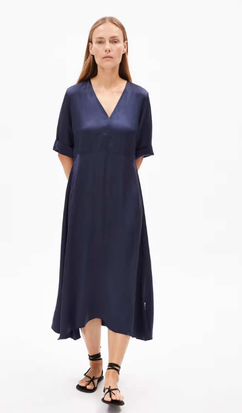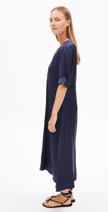 VAALI er léttur og stílhreinn kjóll sem sameinar sjálfbæra hönnun og tímalausa fegurð. Hann er saumaður úr 100% Naia™ Renew acetati, sem er mjúkt og silkimjúkt efni unnið úr viðartrefjum og endurunnu plasti. Kjóllinn hefur laust, beint snið sem fellur fallega og veitir góða hreyfigetu