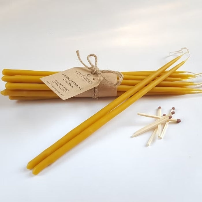 Há og mjó kerti 2 stk saman. Handgerð úr hráu & náttúrulegu býflugnavaxi. Engin óæskileg efni, 100% hreint & sjálfbært býflugnavax. Bómullarþráðurinn er úr óbleiktri bómull.