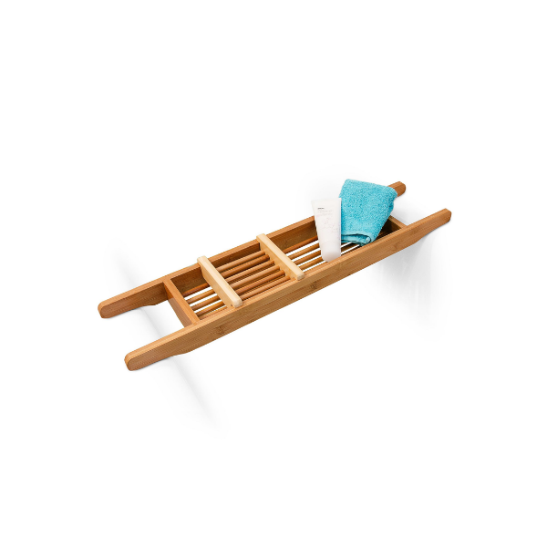 Heima heilsulindin er tekin á næsta stig með baðkarshillu úr bambus.