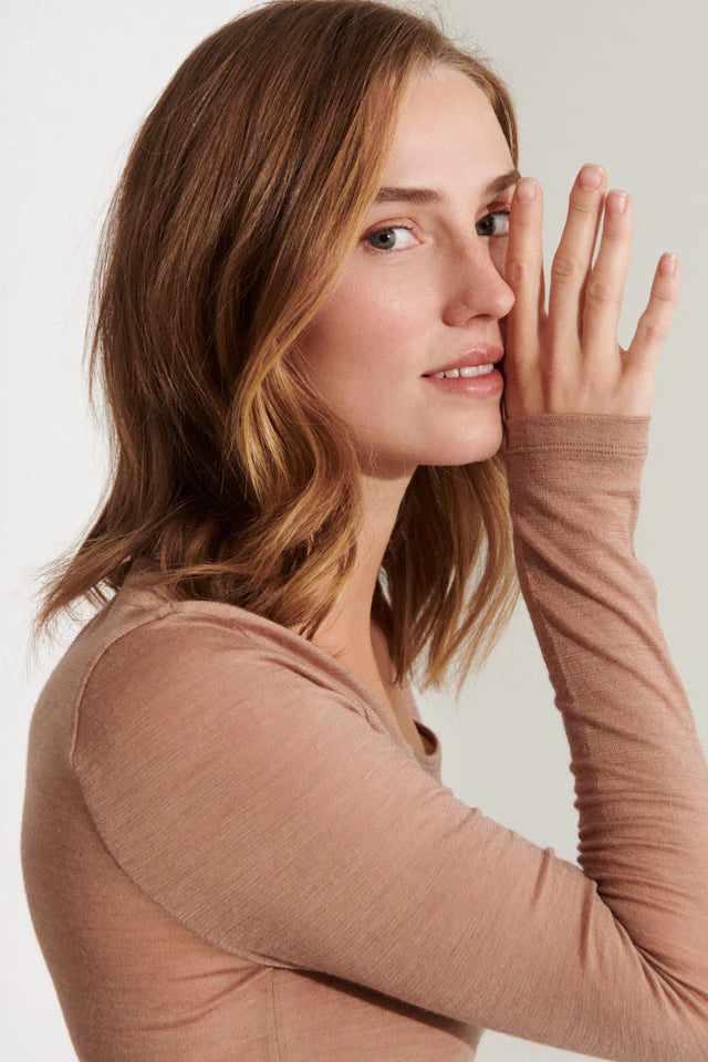 Þessi fallegi bolur sameinar hlýju ullarinnar, mýkt viskóssins og lúxusáferð kasmírs í einni léttari og teygjanlegri flík. Efnisblandan er bæði endurunnin og sjálfbær, sem gerir bolinn að meðvitaðri og umhverfisvænni vali án þess að fórna þægindum eða gæðum.