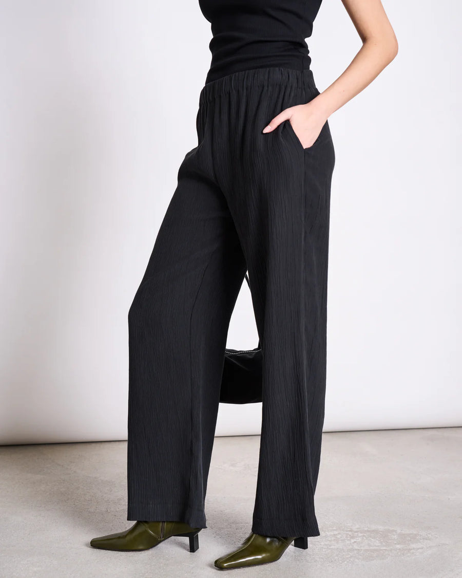 Elevate your style with CRINKLE PANTS HAVA BLACK. These black pants feature a soft crinkle texture and a thin, breathable design for ultimate comfort.