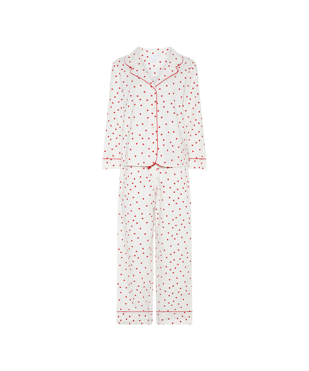 Náttskyrtan er hönnuð með kraga, tölulokun og framvösum ásamt löngum ermum. Náttfatasettið er með sætum rauðum hjörtum.
