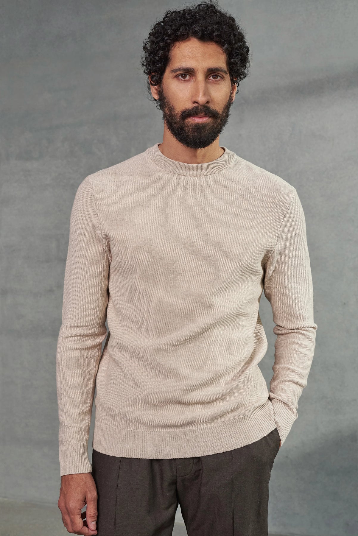Grunnurinn er fínt garn úr vottaðri lífrænni bómull sem er spunnið í Brescia á Ítalíu af sérfræðingum við vottaðar aðstæður. Þegar það er prjónað fær efnið einstaka áferð. Flíkin er mjúk við húðina og andar vel, sem gerir hana að áreiðanlegum félaga í fataskápnum allt árið.