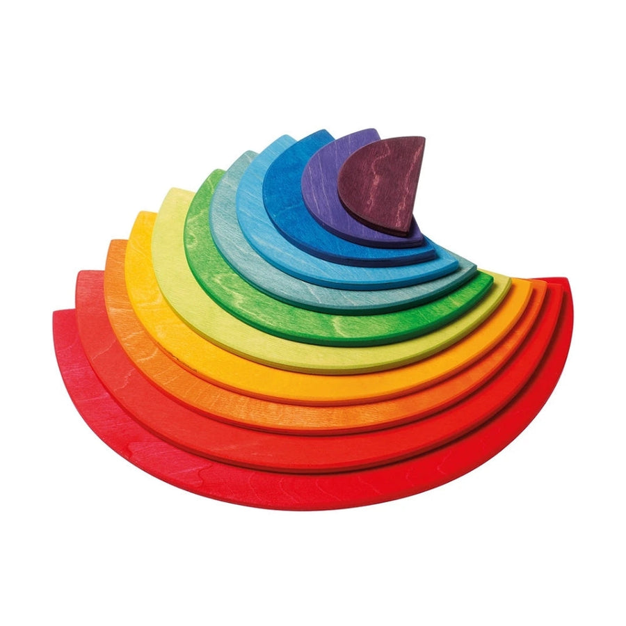 Óþrjótandi möguleikar við leik. Hægt er að nota hálfhringina við að búa til regnboga eða raða í falleg mynstur. Hægt er að nota hálfhringina með stóra regnboganum frá Grimms til þess að búa til regnbogahús og litrík mannvirki.