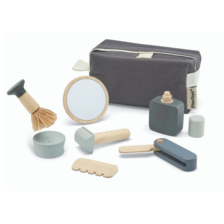 Raksturs hlutverkasettið inniheldur leikfangaspegil, greiðu, rakvélar, rakstursbursta og stand, rakstursfroðuflösku og þvottapoka. Fullkomið sett fyrir börn sem vilja líka eftir daglegum störfum í heiminum í kringum þau.