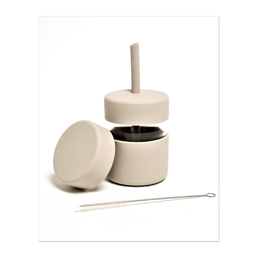 Þetta frábæra og fallega ílát er í senn drykkjarbolli og naslílát. Ílátið er lekahelt og kemur með tveimur silíkonlokum, annað er með gati í miðju fyrir rör sem fylgir með og er notað til að loka ílátinu þegar það er notað fyrir drykki, hitt er alveg heilt til að loka ílátinum þegar það er notað undir mat. Hreinsibursti fyrir rör fylgir með.
