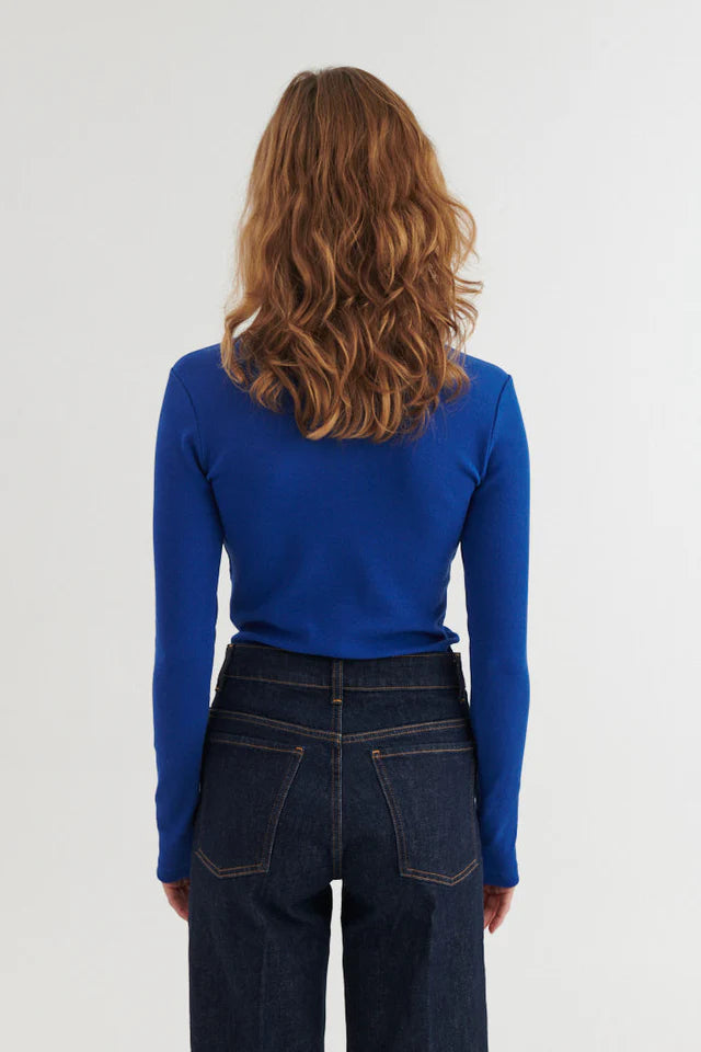Hann er saumaður af alúð úr mjúkum, GOTS-vottuðum lífrænum bómull. Sniðið er aðsniðið, sem gerir hann fullkominn bæði einn og undir peysur eða jakka. Athugaðu þó að stærðirnar mælast minni en venjulega vegna þröngs sniðs – en teygjanlegt efnið þýðir að þú getur samt pantað þína venjulegu stærð.