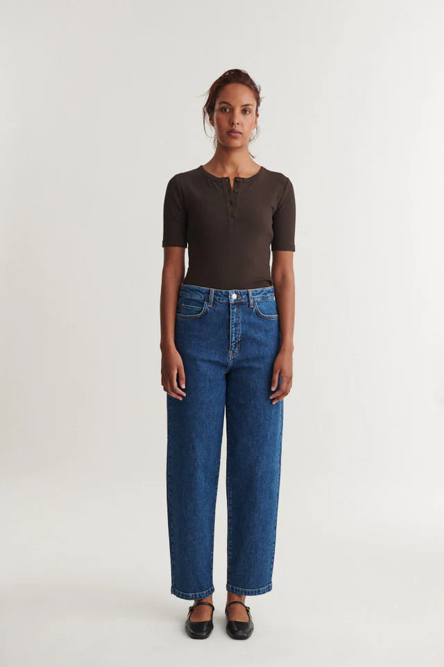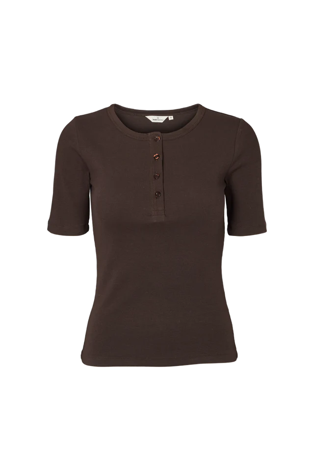 Ludmilla SS Granddad er aðsniðinn toppur með stuttum ermum, hringlaga hálsmáli og hnappalista að framan sem skapar hreint og kvenlegt yfirbragð. Sniðið liggur fallega að líkamanum án þess að þrengja og myndar einfalt og afslappað silúett.