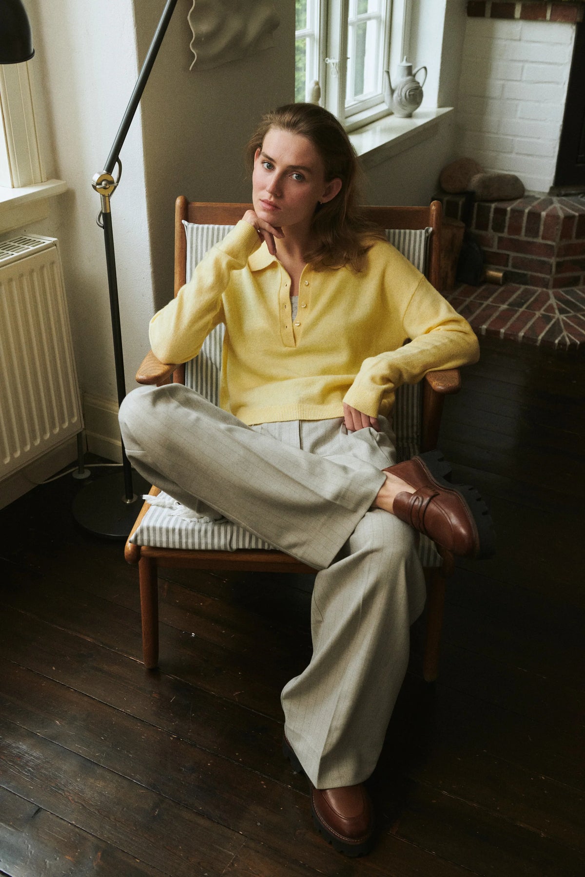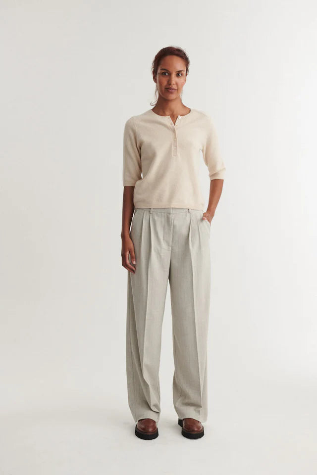 Marjo buxurnar sameina stíl og þægindi á fullkominn hátt. Þær eru með víðum skálmum, fellingum að framan og hliðarsnúningsvösum sem gefa þeim bæði fágað og afslappað yfirbragð. Stillanlegt mitti með tölum tryggir góða og sveigjanlega passformu, og rennilás og hnappur í bragu halda sniðinu klassísku.