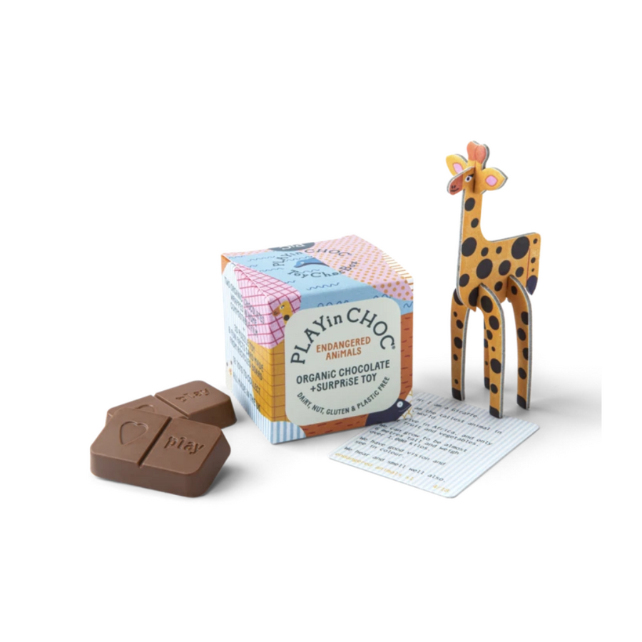 Hvert ToyChoc Box inniheldur tvö ljúffeng sér innpökkuð, rjómakennd, lífræn, mjólkurlaus súkkulaði. í ToyChoc boxinu er einnig að finna þvívíddar pappa púsl til þess að setja saman ásamt skemmtilegu staðreyndar korti Hvaða dýr í útrýmingarhættu færð þú? Pöndu? Gíraffa? Orangutang? eða Ljón?Það eru 18 mismunandi dýr til þess að safna og hver og eitt kemur með sitt eigið fræðandi og skemmtilega staðreyndarkorti. . 100% organicDairy, Nut, Gluten Soy & Plastic FREE 100% organic ingredients:cacao solids (cacao butter, cacao mass), coconut sugar, creamed coconut (24%), vanilla pods.