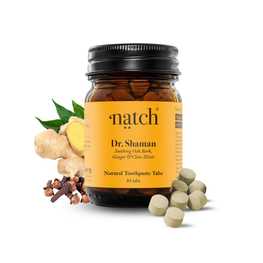 Dr. Shaman tannkremstöflurnar frá Natch sameina lífrænar ilmkjarnaolíur úr negul, engifer, myntu og appelsínu, sem eru ríkar af náttúrulegum bólgueyðandi og bakteríudrepandi eiginleikum. Formúlan er styrkt með L-Arginine, amínósýra úr jurtum sem jafnar pH-gildi munnsins, og tannín úr eikarbörk sem hefur bakteríudrepandi eiginleika og hjálpar til við að draga úr viðkvæmni á tannsvæði
