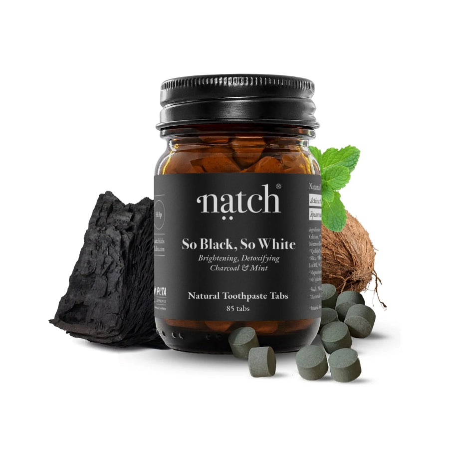 Upplifðu náttúrulega hvítari tennur og hreinni munn með „So Black, So White“ tannkremstöflunum frá Natch. Þessar töflur sameina virk kol og lífræna piparmyntu til að fjarlægja litabletti og eiturefni á náttúrulegan hátt, allt án flúors.