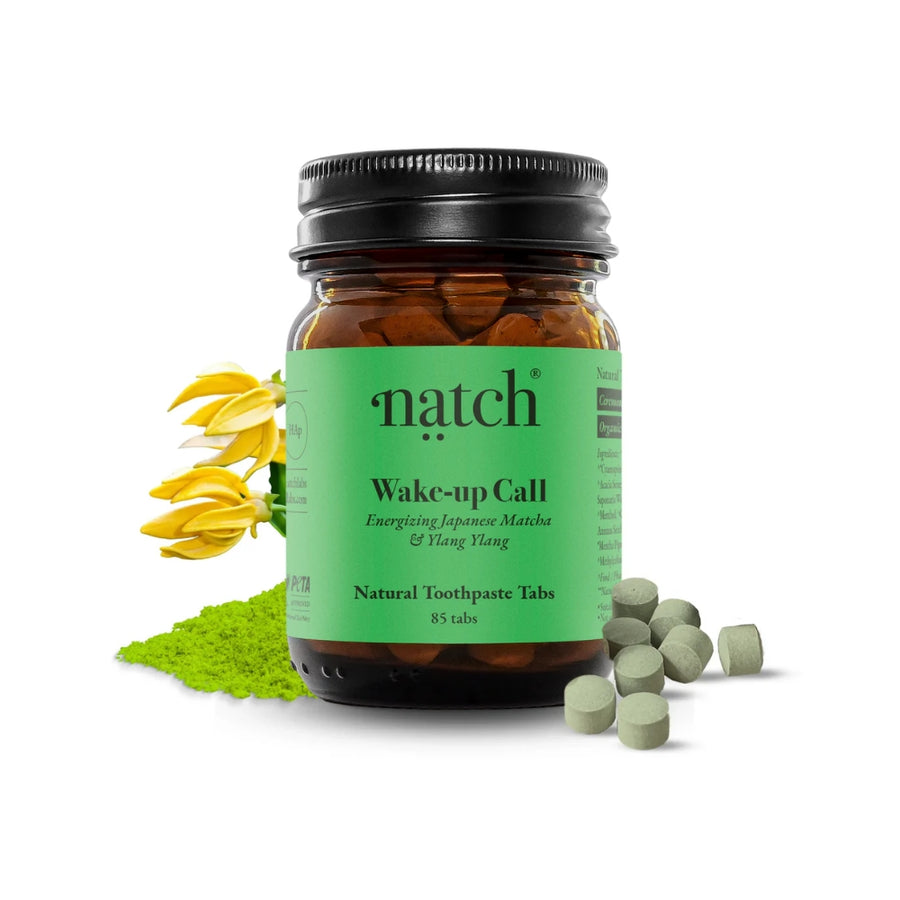 Byrjaðu daginn með ferskleika og orku úr Wake-up Call tannkremstöflunum frá Natch. Þessar náttúrulegu, flúorlausu töflur sameina lífrænt matcha, ylang-ylang og myntu til að veita þér hressandi, myntu-blóma upplifun. Matcha er ríkt af andoxunarefnum og koffíni, Ylang-ylang hefur róandi áhrif og spearmint veitir langvarandi ferskleika.