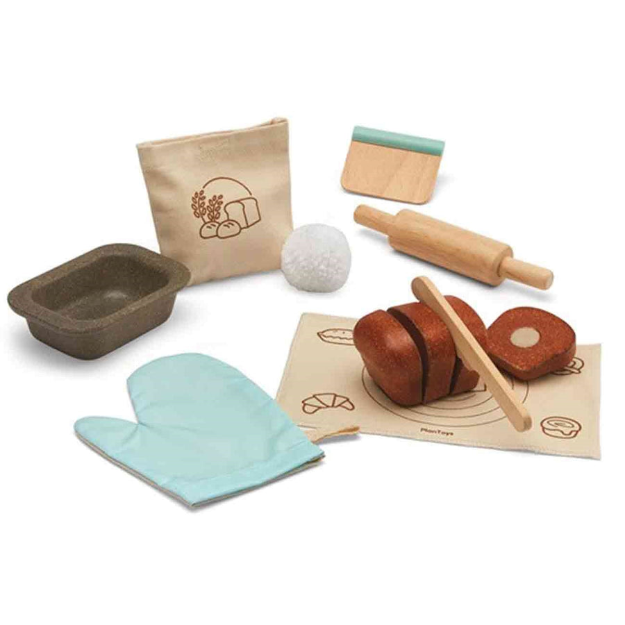 Role play as the owner of a bakery with the Bread Loaf Set! Made from PlanWood, a realistic loaf of bread can be cut with an included bread knife. A bread baking pan, rolling pin, dough-cutting knife, washable oven mitt, bag of pretend flour and bread-kneading mat complete this set and make it a unique addition to kitchen play! Teach little ones how to use the tools properly while encouraging imaginative thinking, fine motor skill development and use of communication during social play.