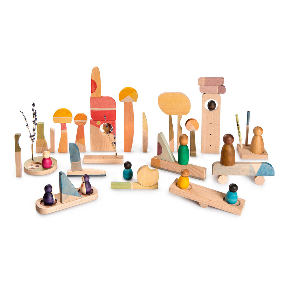 Þetta fallega sett bíður uppá að barnið getur skapað sinn eigin heim, þar sem allir geta notið sín í róleguheitum og haft gaman. Hér eru engar leiðbeiningar eða reglur og hver hlutur er ekki of skilgreindur sem gerir börnum kleift að gefa hverju formi hlutverk eftir þeirra höfði.