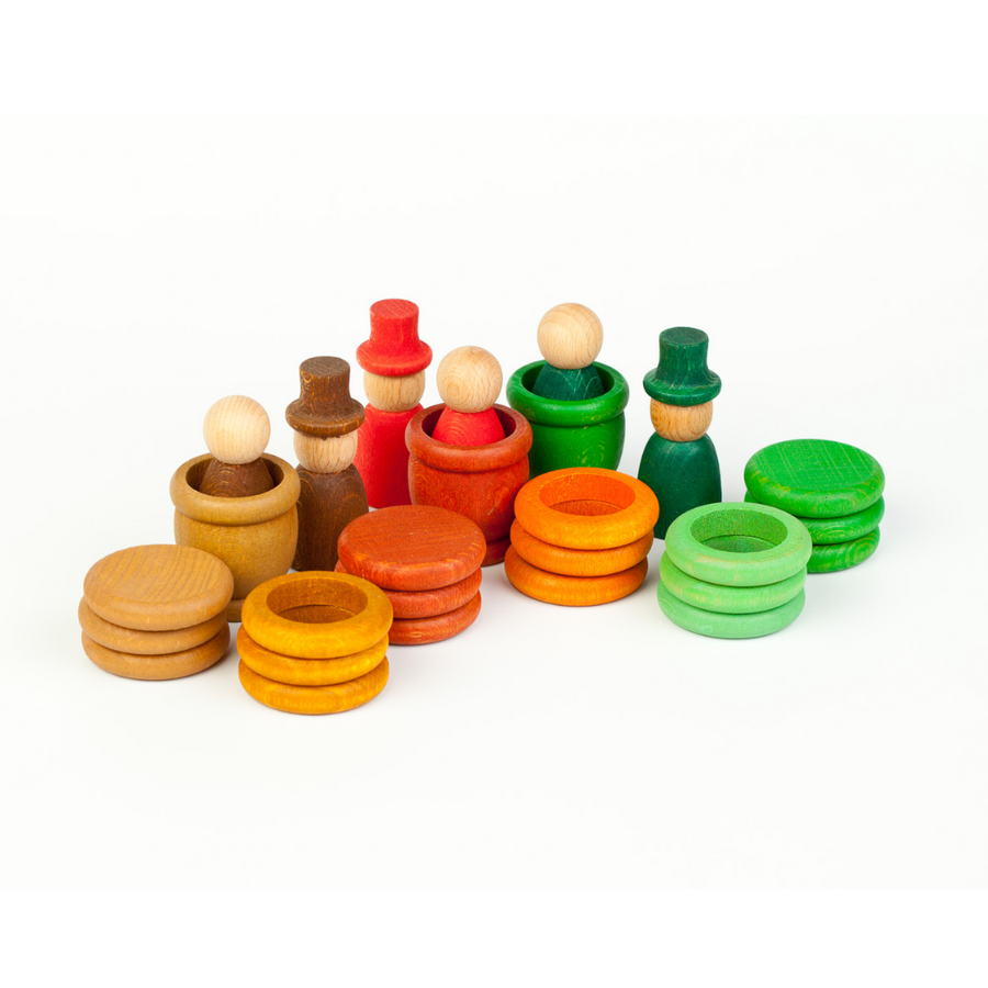 Settið inniheldur 3 Nins, 3 Nins með hatt, 9 hringi og 9 myntir. Einnig fylgir með taupoki fyrir settið.