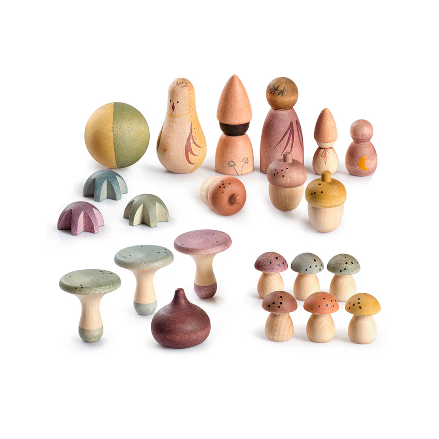Settið inniheldur 22 viðarhluti í miðmunandi stærðum, formi og einstaklega fallegum litum.